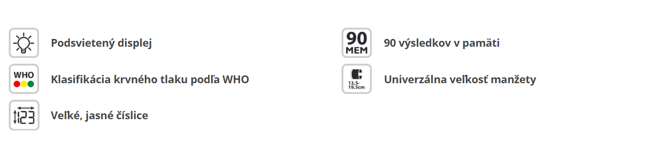 Vďaka farebnému označeniu na bočnej strane sa výsledok merania zobrazí nielen v číslach, ale zaradí sa aj do príslušného rozmedzia klasifikácie krvného tlaku podľa WHO. Ak Váš výsledok spadá do normálneho rozmedzia, označenie je v zelenej časti. Príliš vysoký krvný tlak sa vždy označí v červenej časti a zvýšená hodnota sa zobrazí v žltej časti. Praktický vizuálny ukazovateľ pre lepšie zhodnotenie výsledkov.